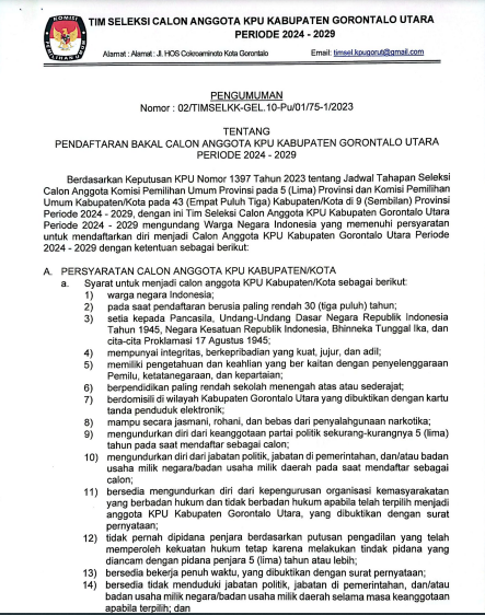 Pengumuman Nomor 02 /TIMSELKK-GEL-10-Pu/01/75-1/2023 Tentang Pendaftaran Bakal Calon Aggota KPU Gorontalo Utara Seleksi Calon Anggota KPU Kabupaten Gorontalo Utara Periode 2024 - 2029 silahkan unduh disini