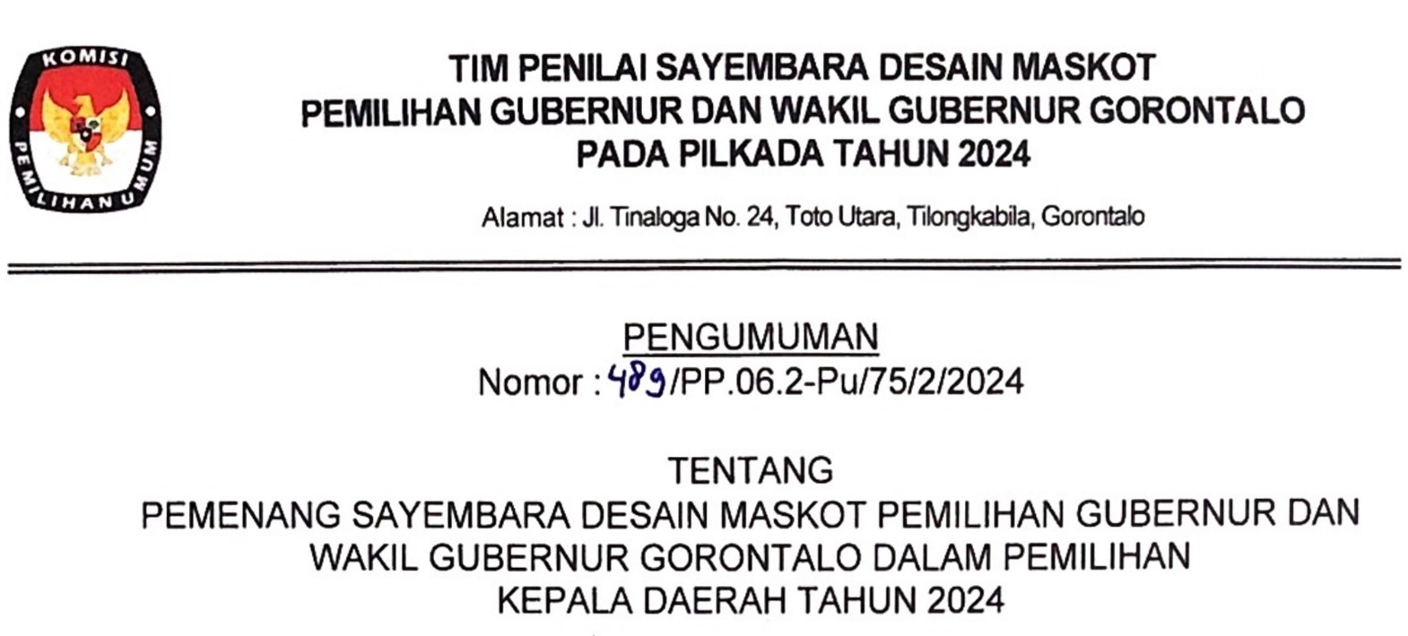 Pengumuman Pemenang Sayembara Desain Maskot Pemilihan Gubernur dan Wakil Gubernur Gorontalo dalam Pemilihan Kepala Daerah Tahun 2024