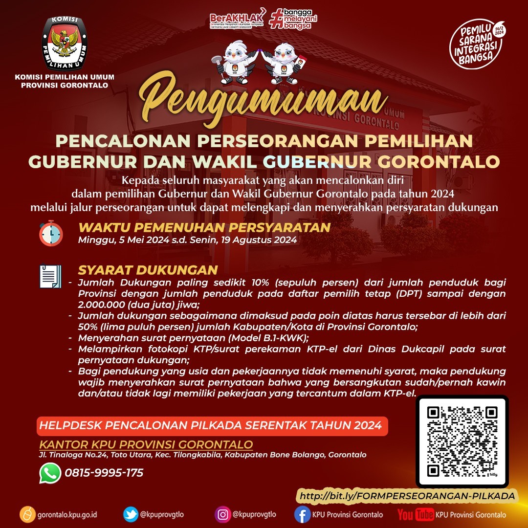 #TemanPemilih, berikut Pengumuman Pencalonan Perseorangan Pemilihan Gubernur dan Wakil Gubernur Gorontalo pada Pilkada Serentak Tahun 2024.