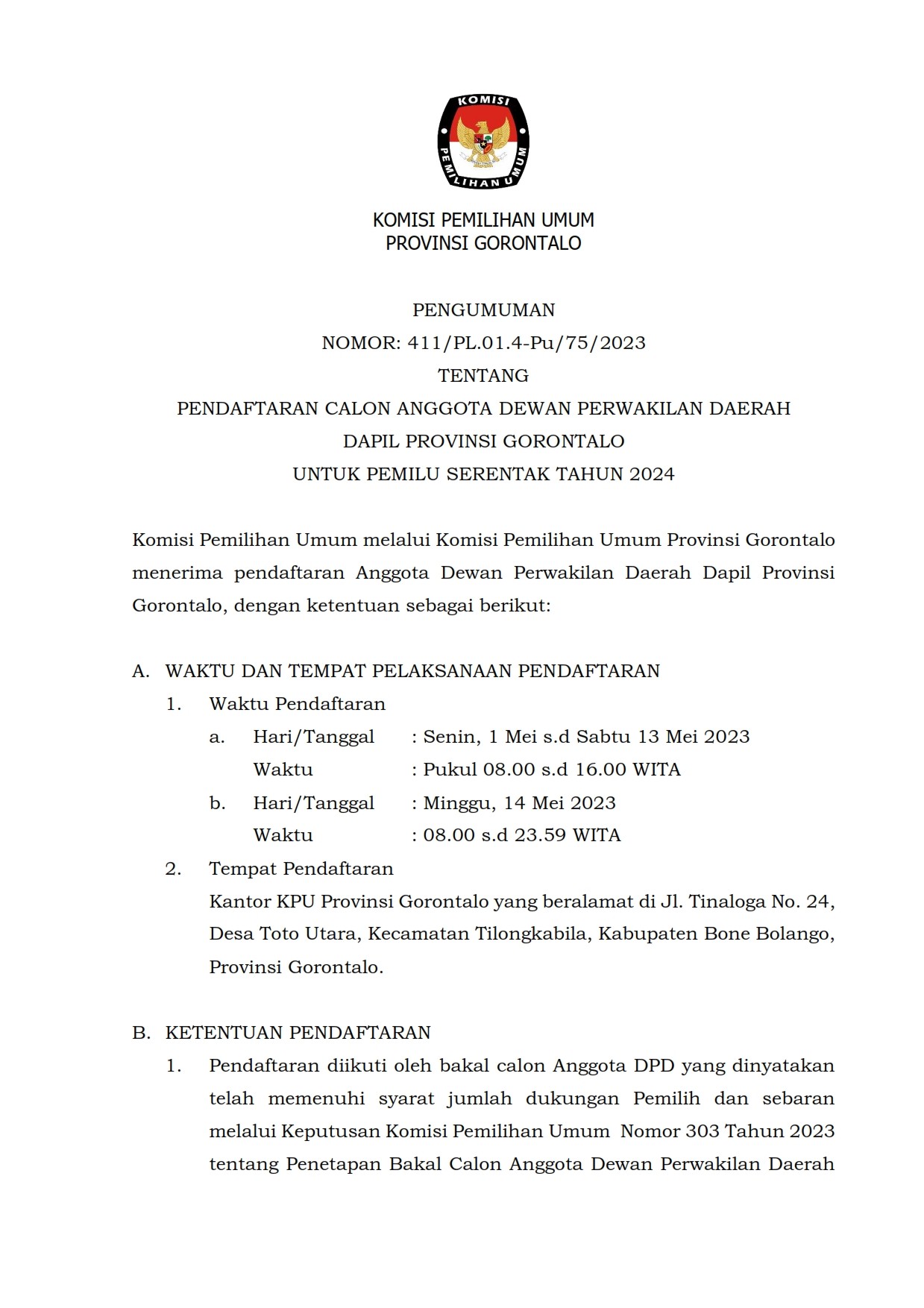 PENGUMUMAN NOMOR: 411/PL.01.4-Pu/75/2023 TENTANG PENDAFTARAN BAKAL CALON ANGGOTA DEWAN PERWAKILAN DAERAH PROVINSI GORONTALO UNTUK PEMILU SERENTAK TAHUN 2024