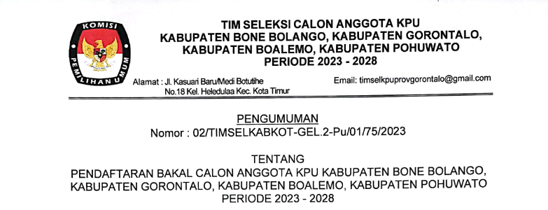 Pengumuman Seleksi Calon Anggota KPU Kabupaten Bone Bolango, KPU Kabupaten Gorontalo, KPU Kabupaten Boalemo, & KPU Kabupaten Pohuwato bisa diunduh DISINI
