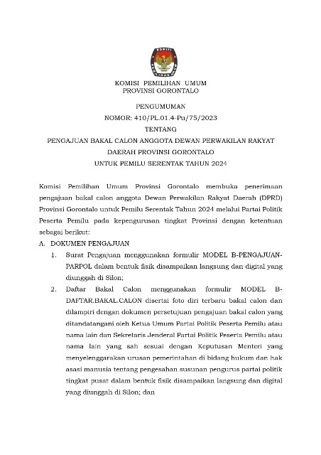 PENGUMUMAN NOMOR: 410/PL.01.4-Pu/75/2023 TENTANG PENGAJUAN BAKAL CALON ANGGOTA DEWAN PERWAKILAN RAKYAT DAERAH PROVINSI GORONTALO UNTUK PEMILU SERENTAK TAHUN 2024