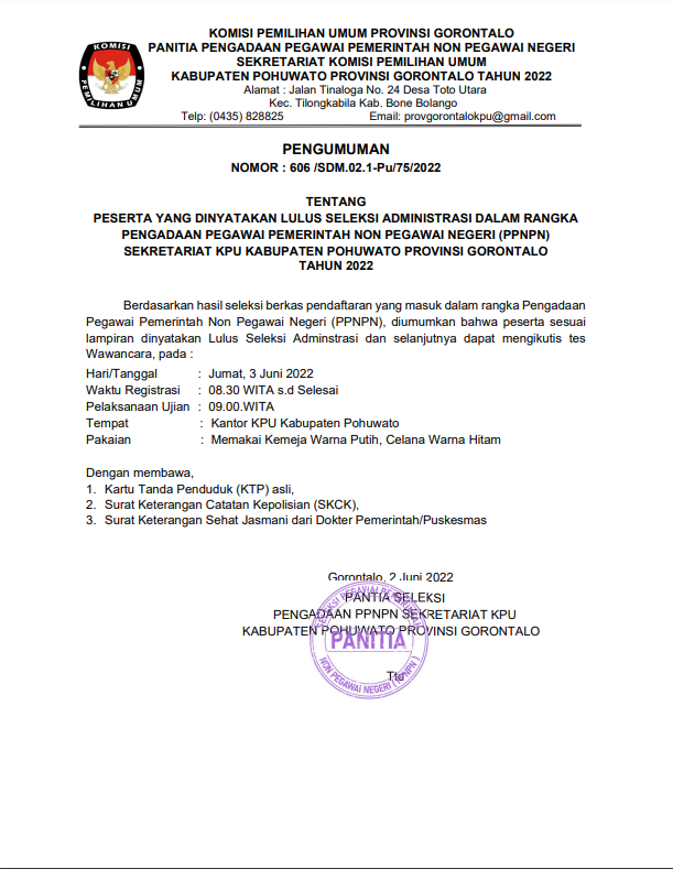 Pengumuman Nomor 606/SDM.02.1-Pu/75/2022 tentang Pengumuman Peserta yang dinyatakan lulus seleksi administrasi dalam rangka pengadaan Pegawai Pemerintah Non Pegawai Negeri (PPNPN) Sekretariat KPU Kabupaten Pohuwato Tahun 2022