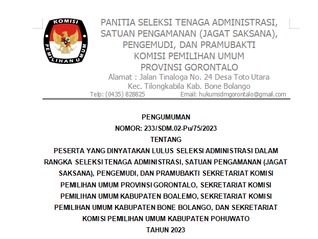 Pengumuman Nomor: 233/SDM.02-Pu/75/2023 tentang Peserta Yang Dinyatakan Lulus Seleksi Administrasi Dalam Rangka Seleksi Tenaga Administrasi, Satuan Pengamanan (Jagat Saksana), Pengemudi, Dan Pramubakti Sekretariat Komisi Pemilihan Umum Provinsi Gorontalo, Sekretariat Komisi Pemilihan Umum Kabupaten Boalemo, Sekretariat Komisi Pemilihan Umum Kabupaten Bone Bolango, Dan Sekretariat Komisi Pemilihan Umum Kabupaten Pohuwato Tahun 2023