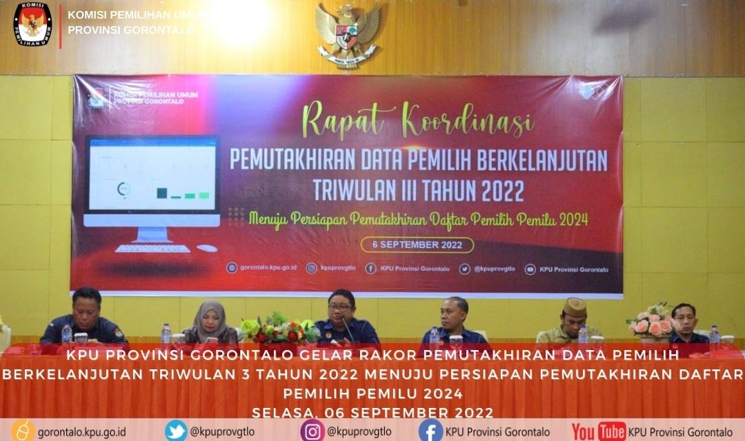 Komisi Pemilihan Umum Provinsi Gorontalo menggelar kegiatan Rapat koordinasi pemutakhiran daftar pemilih berkelanjutan (PDPB) triwulan 3 tahun 2022 menuju pemutakhiran daftar pemilih pemilu 2024 di Hotel Damhil Kota Gorontalo (06/09/22).