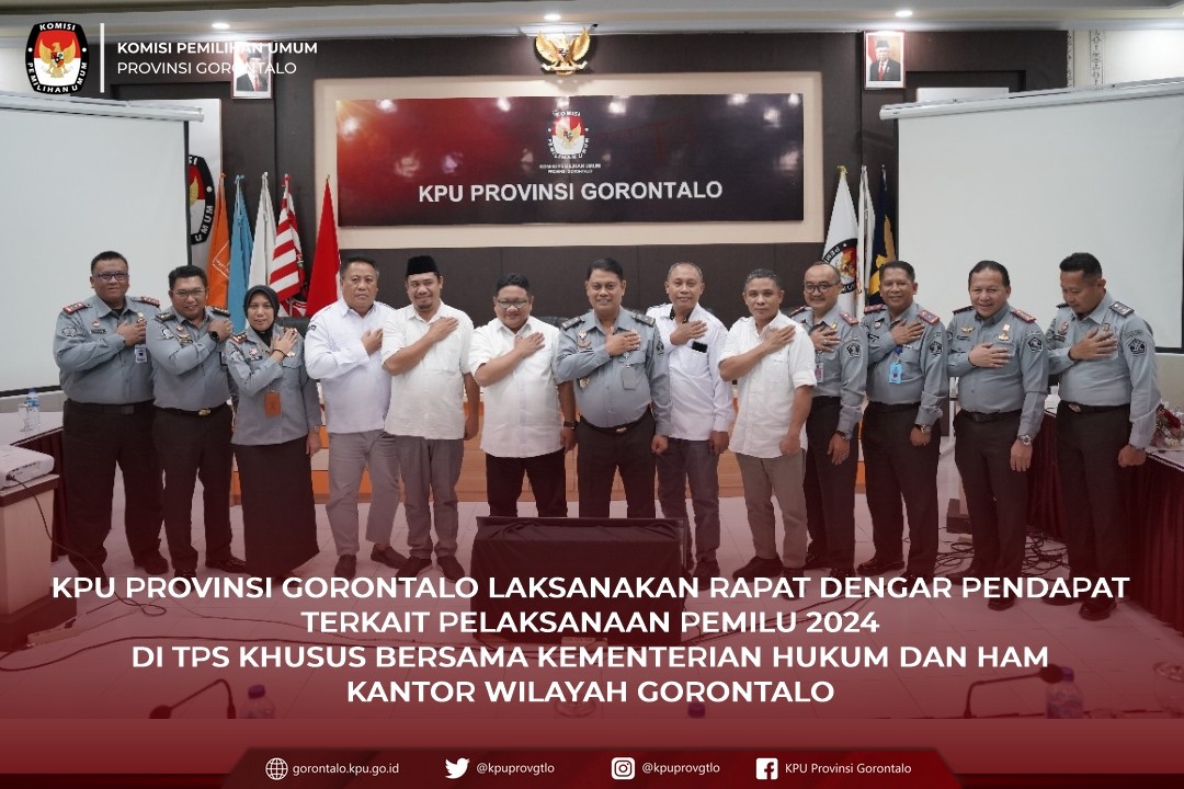 Ketua KPU Provinsi Gorontalo, Fadliyanto Koem, dan Anggota KPU Provinsi Gorontalo, Risan Pakaya, Sophian Rahmola, Opan Hamsah, serta Sekretaris KPU Provinsi Gorontalo, Mukti Abdullatif Mile, membuka Rapat Dengar Pendapat terkait Pelaksanaan Pemilu 2024 di TPS Khusus bersama Kementerian Hukum dan HAM Kantor Wilayah Gorontalo di Aula KPU Provinsi Gorontalo, Senin (8/01/24).