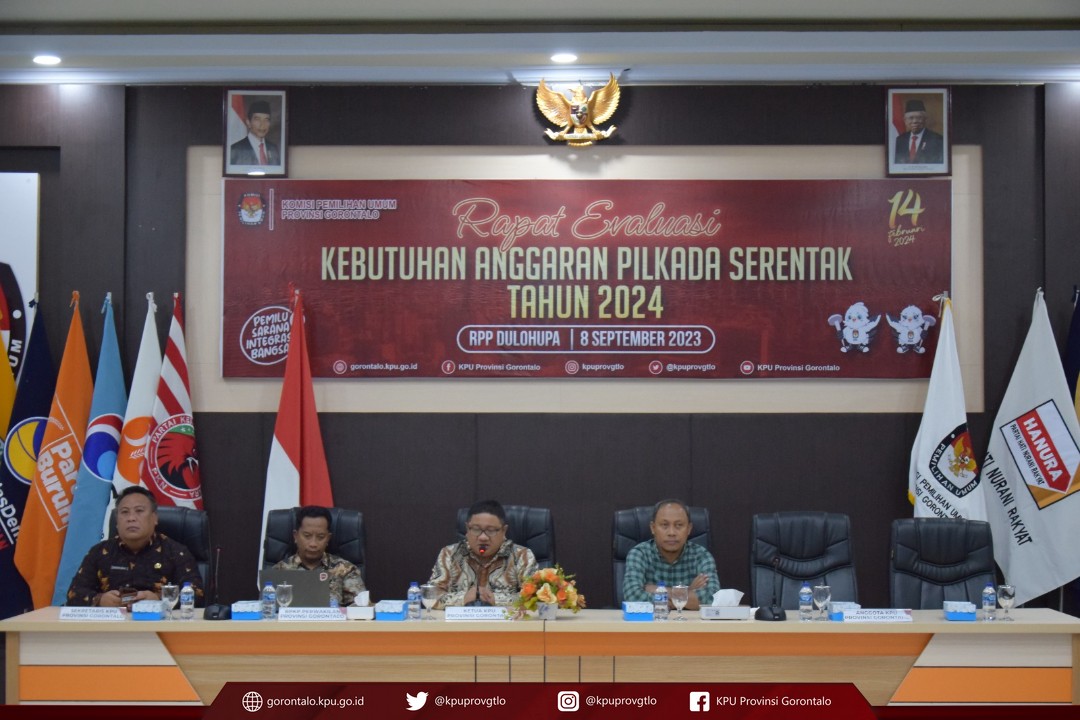 Rapat Evaluasi Kebutuhan Anggaran Pilkada Serentak Tahun 2024 dilaksanakan Kantor KPU Provinsi Gorontalo pada Jumat, 8 September 2023. Acara tersebut dibuka oleh Ketua KPU Provinsi Gorontalo, Fadliyanto Koem, yang turut didampingi oleh Anggota KPU Provinsi Gorontalo, Sophian Rahmola, dan Sekretaris KPU Provinsi Gorontalo, Mukti Abdullatif Mile. Kehadiran peserta dari KPU Kabupaten/Kota juga menjadi sorotan, teradiri dari Ketua dan Anggota KPU Kabupaten/Kota, Sekretaris KPU Kabupaten/Kota, serta Kepala Sub Bagian Rendatin KPU Kabupaten/Kota.