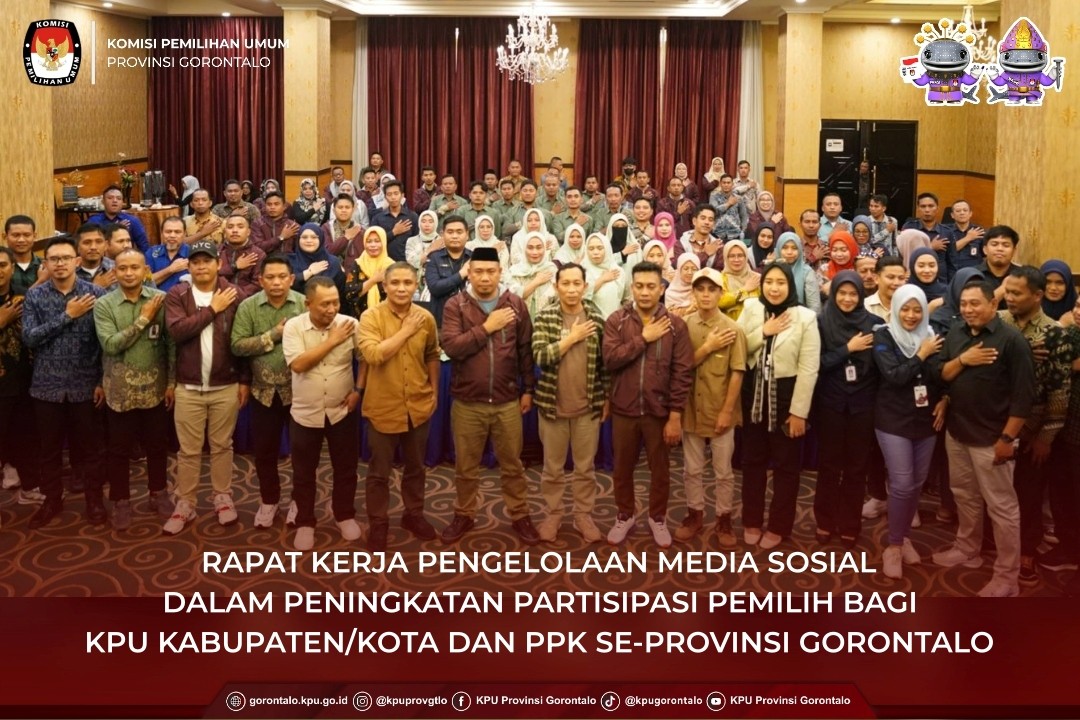 Plt. Ketua KPU Provinsi Gorontalo, Risan Pakaya, bersama Anggota KPU Provinsi Gorontalo Hendrik Imran, Opan Hamsah, dan Sophian Rahmola membuka kegiatan Rapat Kerja Pengelolaan Media Sosial sebagai Upaya Peningkatan Partisipasi Pemilih pada Pilkada Serentak Tahun 2024 bagi KPU Kabupaten/Kota dan PPK se-Provinsi Gorontalo. Acara tersebut berlangsung di Hotel D'Grand Q pada Jumat, 2 Agustus 2024.