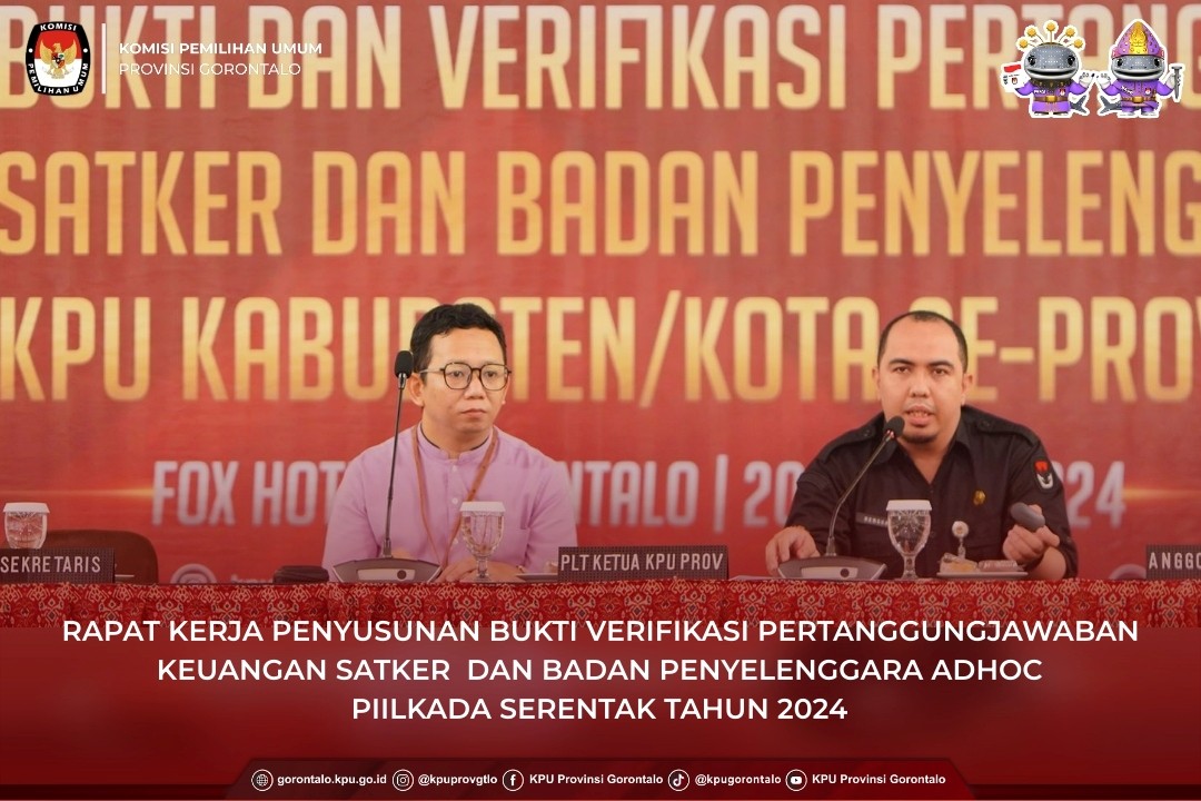 #TemanPemilih, Plt. Ketua KPU Provinsi Gorontalo, Risan Pakaya, bersama dengan Plt. Sekretaris KPU Provinsi Gorontalo, R. Suryanto, secara resmi membuka kegiatan Rapat Kerja Penyusunan Bukti Verifikasi Pertanggungjawaban Keuangan Satker dan Badan Penyelenggara Adhoc di lingkungan KPU Kabupaten/Kota se-Provinsi Gorontalo. Kegiatan ini bertempat di Hotel Fox, Kota Gorontalo, dan akan berlangsung selama dua hari, mulai tanggal 20 hingga 21 Juli 2024.