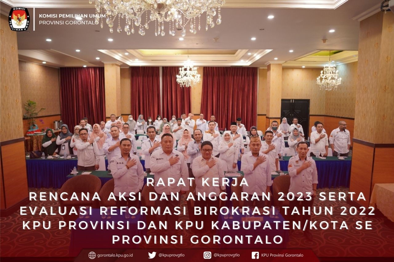 Ketua KPU Provinsi Gorontalo Fadliyanto Koem, Anggota KPU Provinsi Gorobtalo Sophian Rahmola, Hendrik Imran, Ramli Ondang Djau serta Sekretaris KPU Provinsi Gorontalo Mukti Abdullatif Mile menghadiri Rapat kerja Rencana Aksi dan Anggaran tahun 2023 serta Evaluasi Reformasi Birokrasi tahun 2022 sbertempat di hotel GrandQ kota gorontalo (09/01/23)