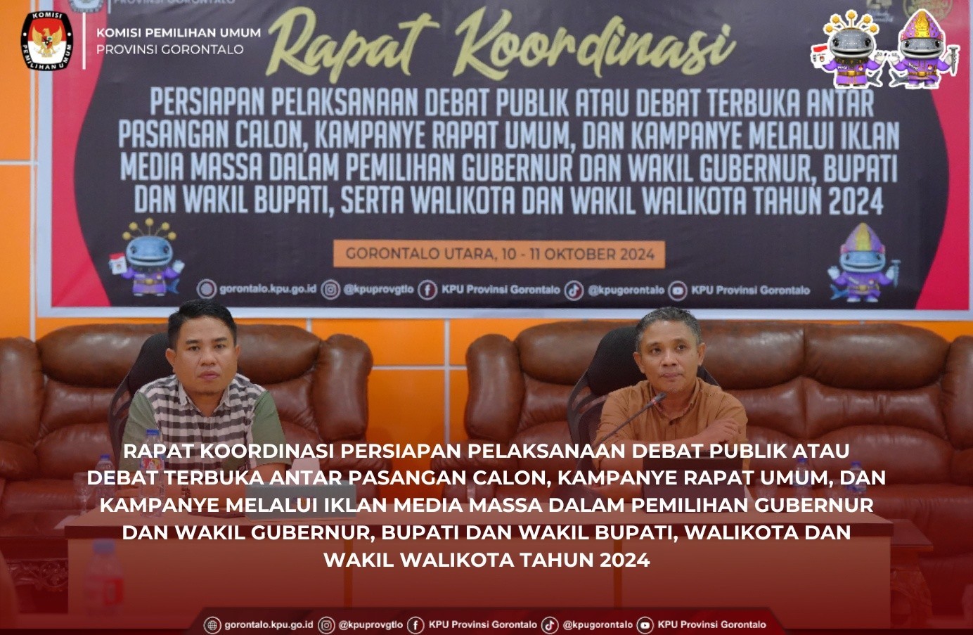 Komisi Pemilihan Umum Provinsi Gorontalo menggelar Rapat Koordinasi Persiapan Pelaksanaan Debat Publik atau Debat Terbuka Antar Pasangan Calon, Kampanye Rapat Umum, dan Kampanye Melalui Iklan Media Massa dalam Pemilihan Gubernur dan Wakil Gubernur, Bupati dan Wakil Bupati, Walikota dan Wakil Walikota Tahun 2024. Acara ini berlangsung di Aula Kantor KPU Gorontalo Utara, Kamis (10/10/2024)