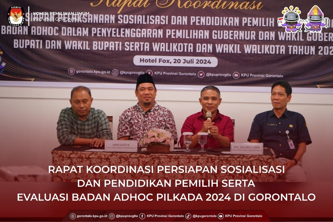 #TemanPemilih, Plt. Ketua KPU Provinsi Gorontalo, Risan Pakaya, bersama anggota KPU Provinsi Gorontalo, Sophian Rahmola dan Opan Hamsah serta Plt. Sekretaris KPU Provisi Gorontalo R. Suryanto, membuka acara Rapat Koordinasi Persiapan Pelaksanaan Sosialisasi dan Pendidikan Pemilih serta Evaluasi Badan Adhoc dalam Penyelenggaraan Pemilihan Gubernur dan Wakil Gubernur, Bupati dan Wakil Bupati, serta Walikota dan Wakil Walikota Tahun 2024. Acara tersebut berlangsung di Hotel Fox, Kota Gorontalo, pada Sabtu, 20 Juli 2023.