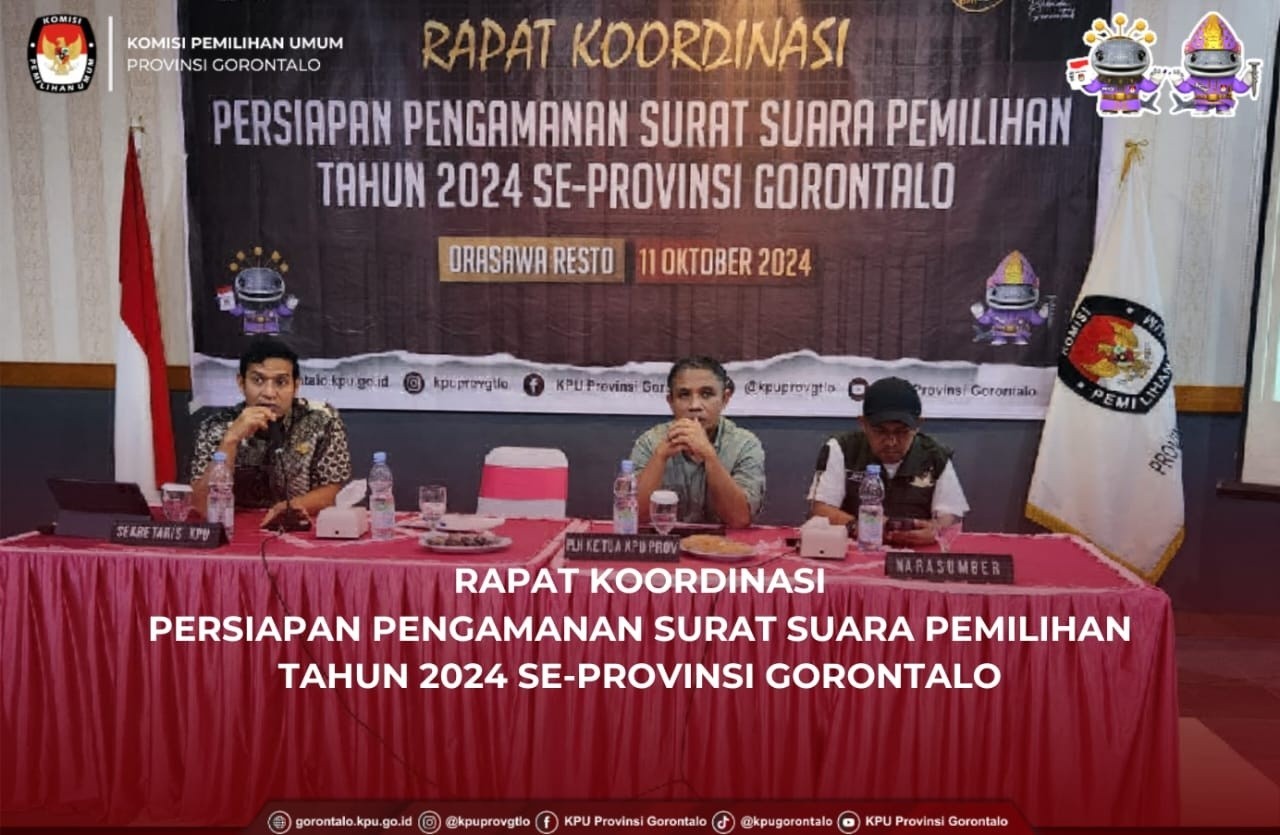 Komisi Pemilihan Umum Provinsi Gorontalo mengadakan Rapat Koordinasi Terkait Persiapan Pengamanan Surat Suara Pemilihan Tahun 2024 se-Provinsi Gorontalo. Bertempat di Orasawa Resto, Jumat (11/10/2024).