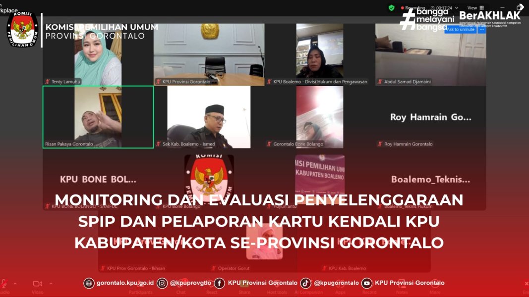 Gorontalo, gorontalo.kpu.go.id - Komisi Pemilihan Umum (KPU) Provinsi Gorontalo melaksanakan Rapat Monitoring dan Evaluasi (Monev) Pelaporan Kartu Kendali untuk Periode Bulan Juni Tahun 2025. Kegiatan ini dilakukan secara daring dan diikuti oleh Plh. Ketua KPU Provinsi Gorontalo, Risan Pakaya dan seluruh jajaran KPU Kabupaten Boalemo, KPU Kabupaten Bone Bolango, serta KPU Kabupaten Gorontalo Utara, Rabu (9/7/2025).