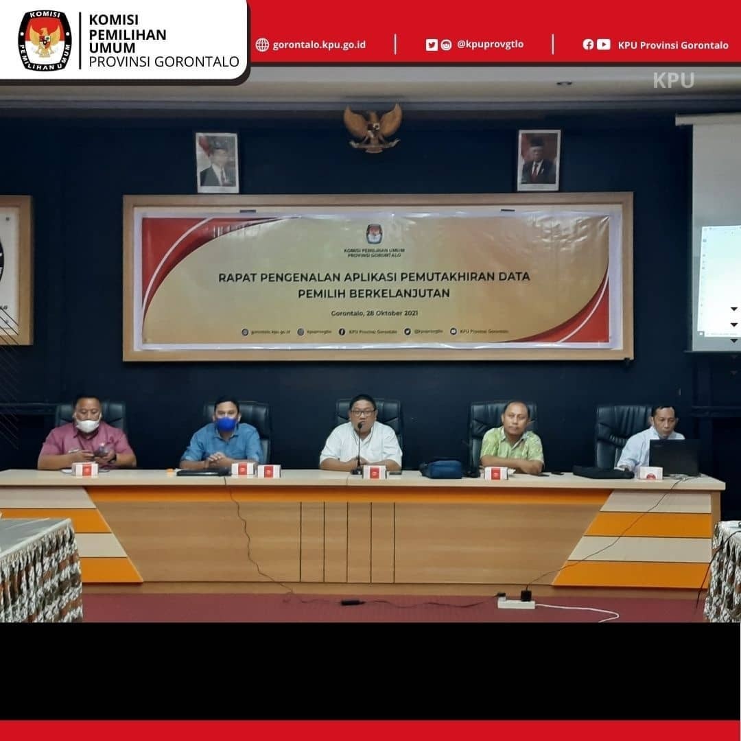 Komisi Pemilihan Umum Provinsi Gorontalo menggelar Rapat Pengenalan Aplikasi Pemutakhiran Data Pemilih Berkelanjutan (PDPB) bersama KPU Kabupaten dan Kota se Provinsi Gorontalo di RPP Dulohupa KPU Provinsi Gorontalo (28/10/21).