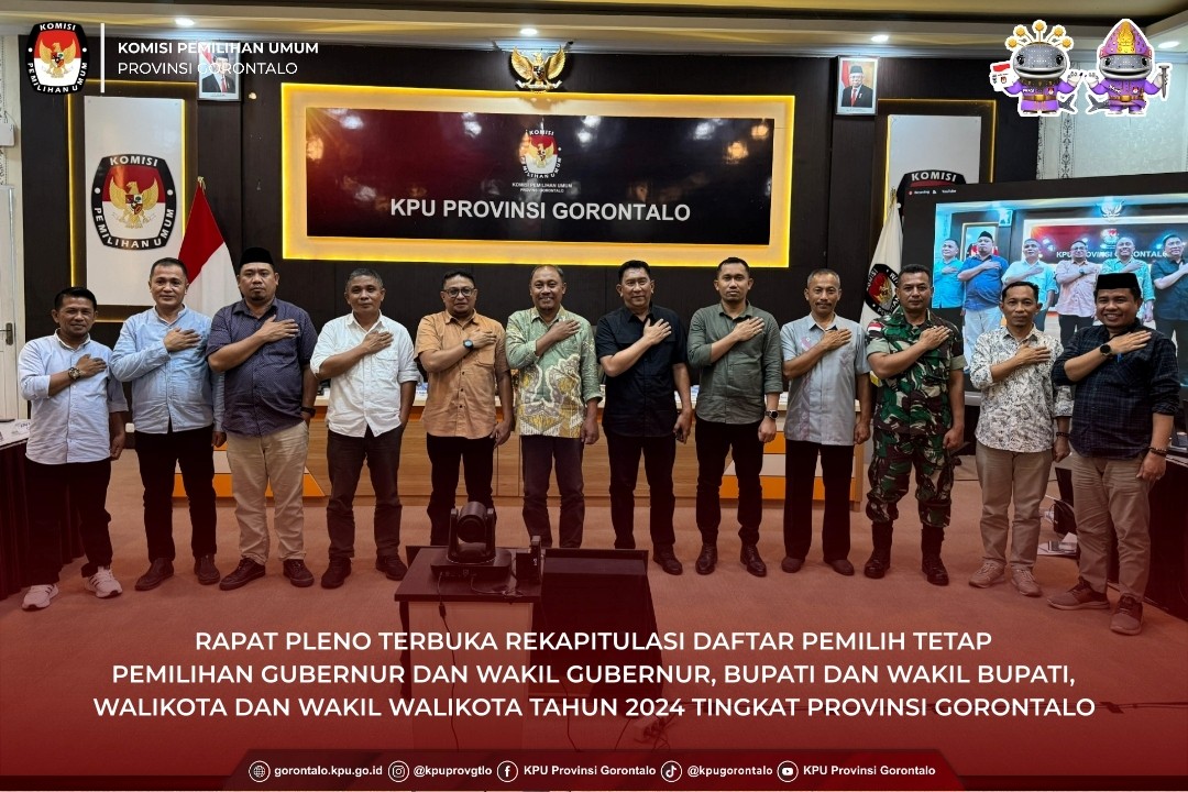 KPU Provinsi Gorontalo menggelar Rapat Pleno Terbuka Rekapitulasi Daftar Pemilih Tetap (DPT) Pemilihan Gubernur dan Wakil Gubernur, Bupati dan Wakil Bupati, serta Wali Kota dan Wakil Wali Kota Tahun 2024 Tingkat Provinsi Gorontalo.