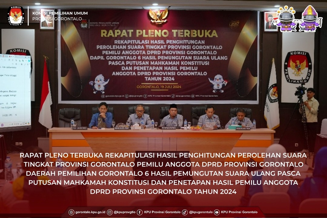 #TemanPemilih, KPU Provinsi Gorontalo menggelar Rapat Pleno Terbuka Rekapitulasi Hasil Penghitungan Perolehan Suara Tingkat Provinsi Gorontalo Pemilu Anggota DPRD Provinsi Gorontalo Daerah Pemilihan Gorontalo 6 Hasil Pemungutan Suara Ulang Pasca Putusan Mahkamah Konstitusi dan Penetapan Hasil Pemilu Anggota DPRD Provinsi Gorontalo Tahun 2024, di Kantor KPU Provinsi Gorontalo, Jumat (19/7).