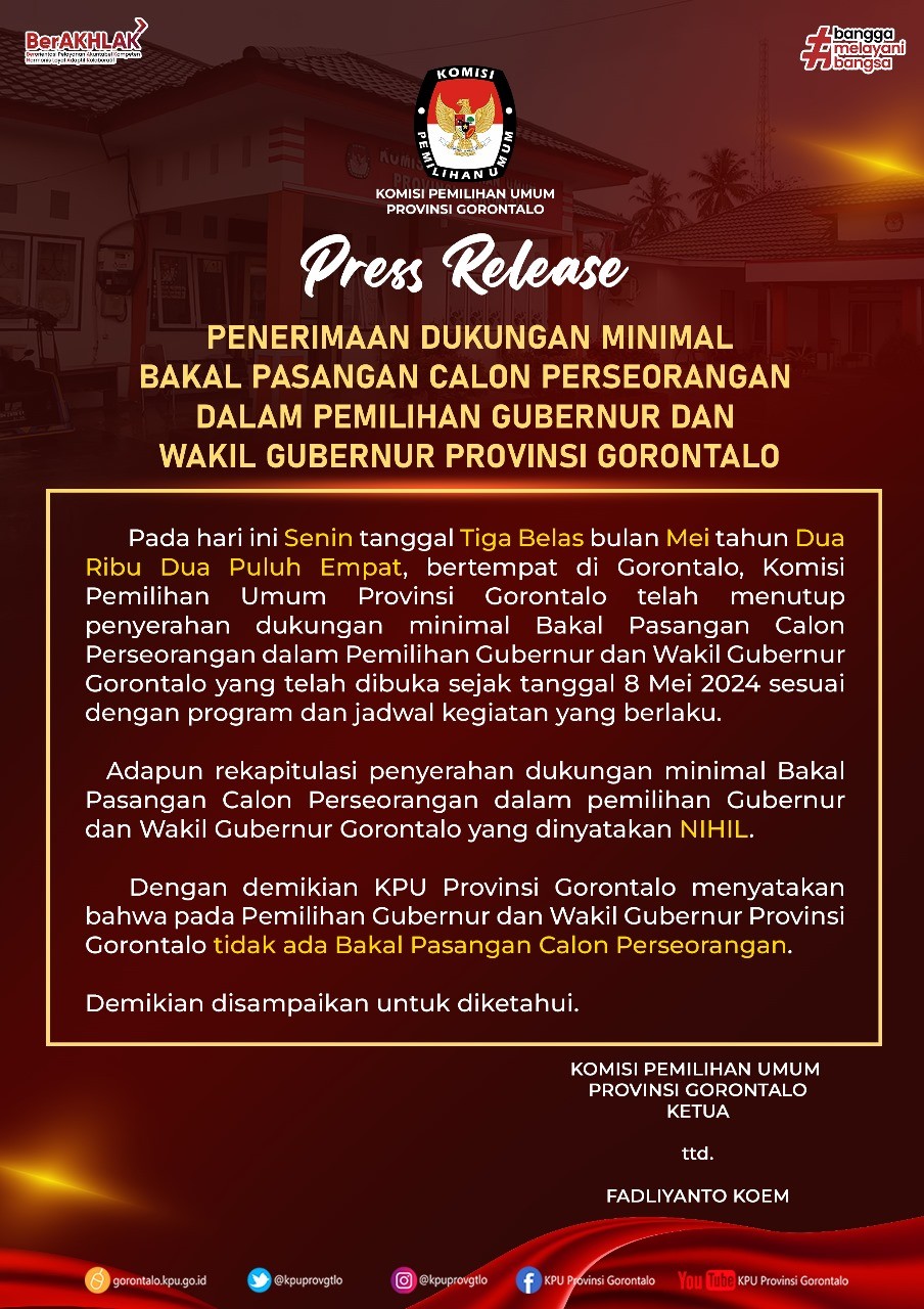 Siaran Pers tentang Rekapitulasi Penyerahan Dokumen Syarat Dukungan Bakal Pasangan Calon Perseorangan dalam Pemilihan Gubernur dan Wakil Gubernur Gorontalo pada Pilkada Tahun 2024