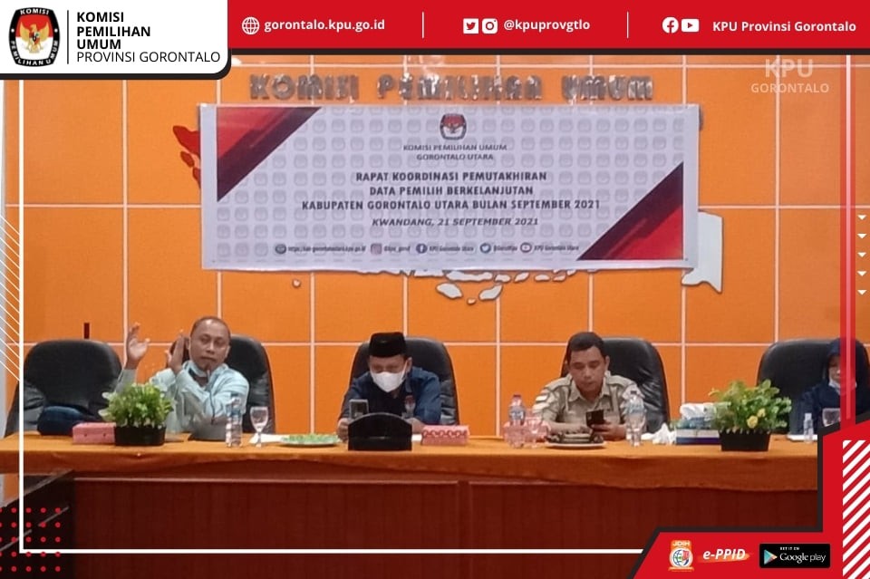 hari ini (21/09/2021) KPU Kabupaten Gorontalo Utara dan KPU Kabupaten Gorontalo melaksanakan Rapat Koordinasi Pemutakhiran Data Pemilih Berkelanjutan Triwulan ke-lll Tahun 2021.