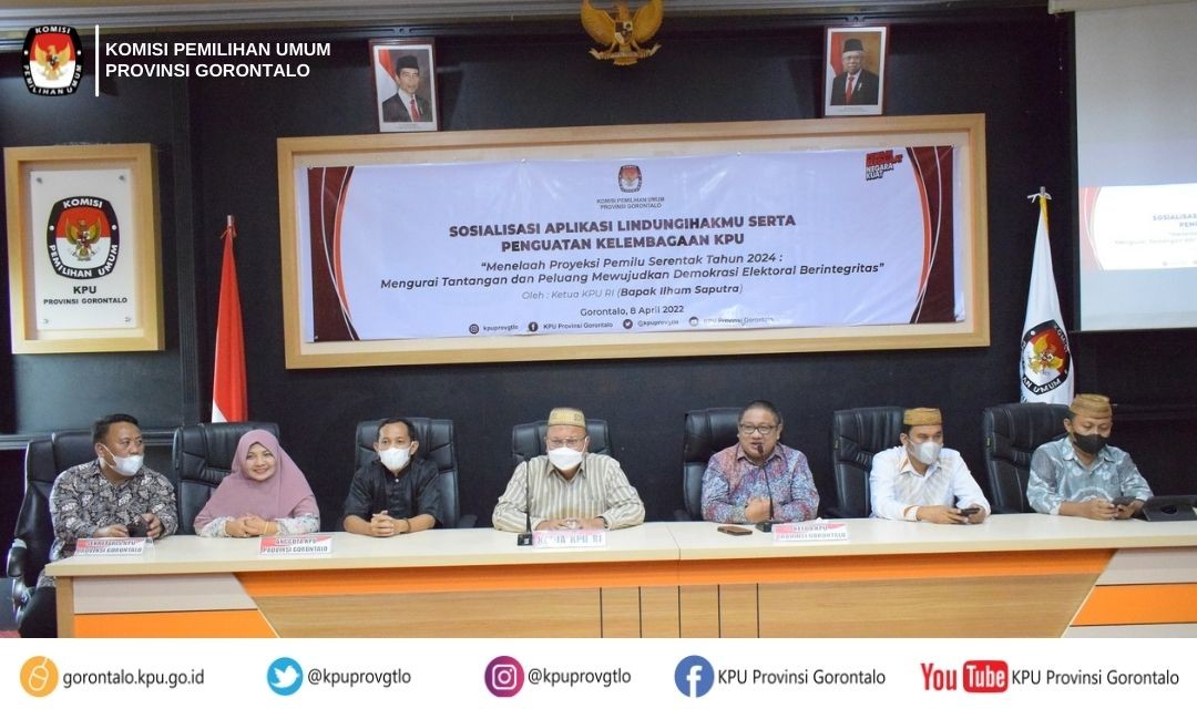 Ketua KPU Provinsi Fadliyanto Koem membuka kegiatan Sosialisasi Aplikasi LindungiHakmu serta Penguatan Kelembagaan KPU, dengan tema “Menelaah Proyeksi Pemilu Serentak Tahun 2024: Mengurai Tantangan dan Peluang Mewujudkan Demokrasi Elektoral Berintegritas”, di kantor KPU Provinsi Gorontalo,dan kegiatan ini dihadiri langsung oleh Ketua KPU RI Ilham Saputra pada kunjungan kerjanya di Provinsi Gorontalo (08/04/22).
