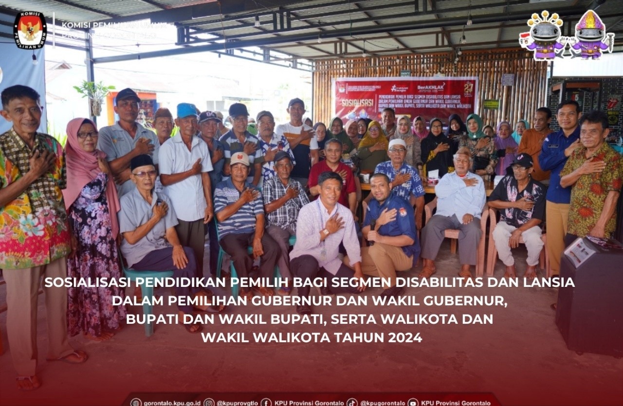 Komisi Pemilihan Umum Provinsi Gorontalo menggelar Sosialisasi Pendidikan Pemilih bagi Segmen Disabilitas dan Lansia. Acara ini bertujuan untuk meningkatkan pemahaman dan partisipasi warga penyandang disabilitas serta lansia dalam Pemilihan Gubernur dan Wakil Gubernur, Bupati dan Wakil Bupati, serta Walikota dan Wakil Walikota Tahun 2024, yang berlangsung berlangsung di Desa Moluo, Kecamatan Kwandang, Kabupaten Gorontalo Utara, Minggu, (13/10/2024)