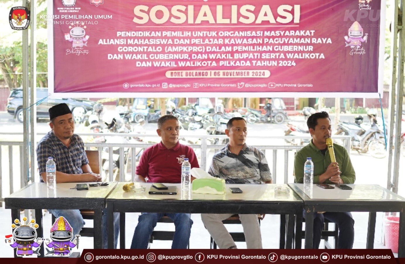 Anggota KPU Provinsi Gorontalo Risan Pakaya bersama Opan Hamsah dan Hendrik Imran Membuka Acara Sosialisasi Pendidikan Pemilih Untuk Organisasi Masyarakat Aliansi Mahasiswa dan Pelajar Kawasan Paguyaman Raya Gorontalo (AMPKPRG) Dalam Pemilihan Gubernur dan Wakil Gubernur, Bupati dan Wakil Bupati, Serta Walikota dan Wakil Walikota Pilkada Tahun 2024 bertempat di RM Malioboro Bone Bolango, Rabu (6/11/2024).