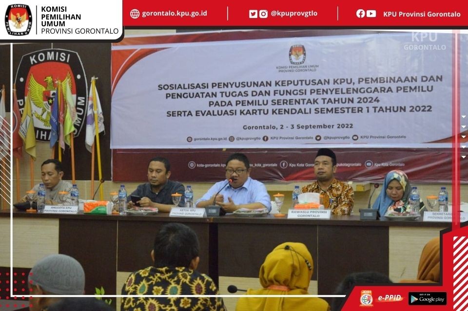 KPU Provinsi Gorontalo menggelar Sosialisasi Penyusunan Keputusan KPU, Pembinaan dan Penguatan Tugas dan Fungsi Penyelenggara Pemilu pada Pemilu Serentak Tahun 2024, serta Evaluasi Kartu Kendali Semester I Tahun 2022, bertempat di KPU Kota Gorontalo dan KPU Kabupaten Gorontalo Utara, Jum'at (02/09/2022).