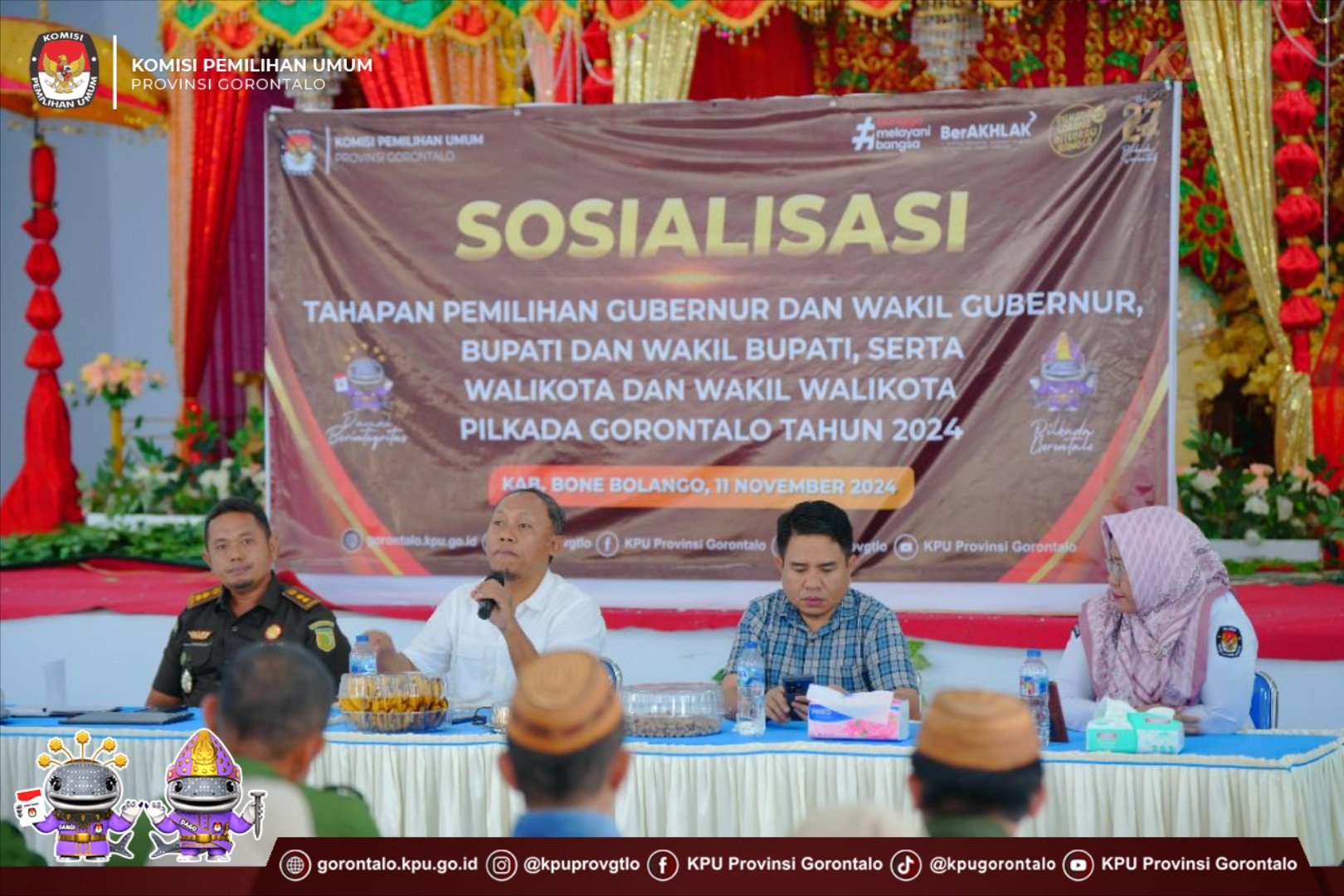 Ketua KPU Provinsi Gorontalo, Sophian Rahmola, membuka acara Sosialisasi Tahapan Pemilihan Gubernur dan Wakil Gubernur, Bupati dan Wakil Bupati, serta Walikota dan Wakil Walikota Pilkada 2024, yang dilaksanakan di Aula Bandayo li Mbui, Kec. Kabila, Kab. Bone Bolango, Senin (11/11/2024).