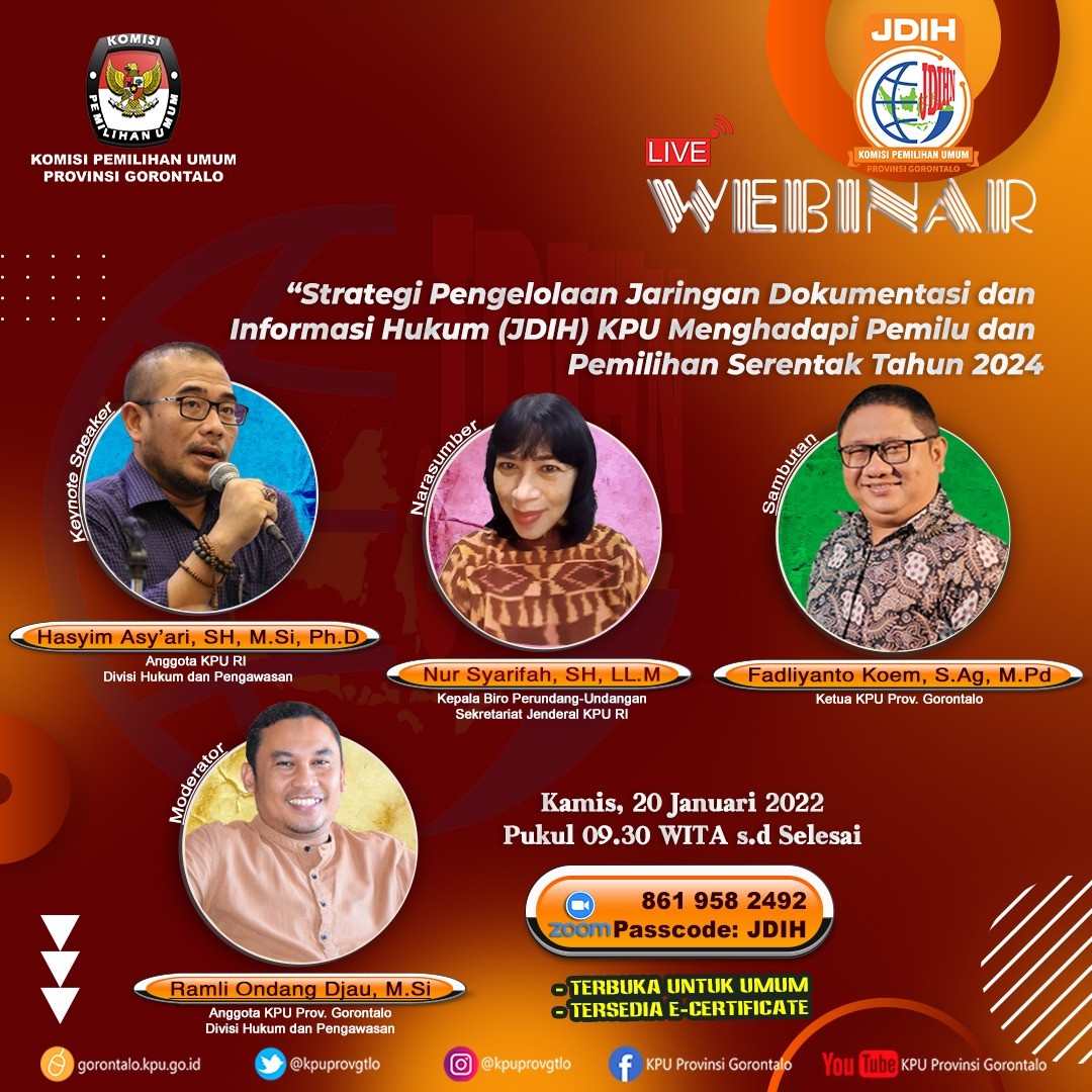KPU Povinsi Gorontalo akan menyelenggarakan Webinar dengan tema Strategi Pengelolaan Jaringan Dokumentasi Informasi Hukum (JDIH) KPU dalam menghadapi Pemilu dan Pemilihan Serentak Tahun 2024.